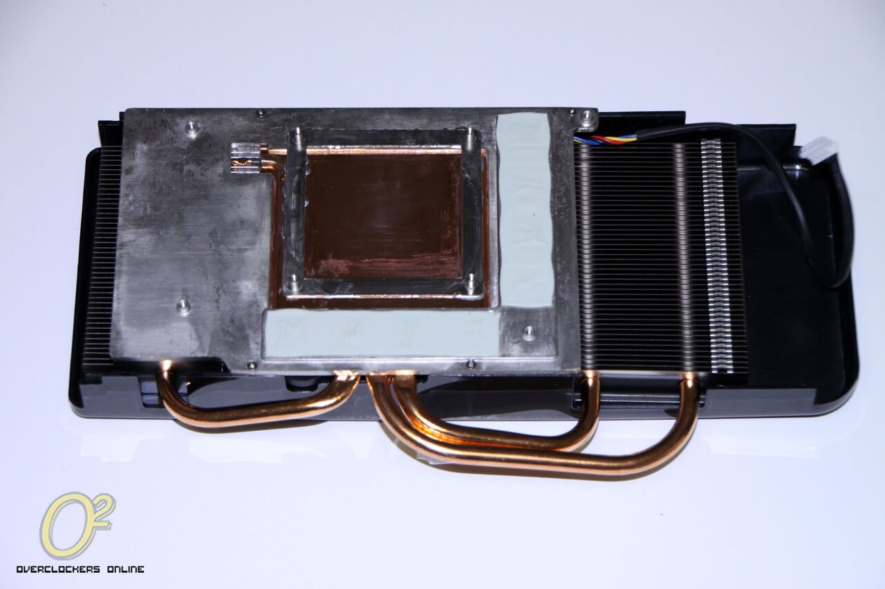 Flipping the card over is pretty uninteresting for all you will find are a few stickers with serial numbers on them and the eight screws required to hold the cooler down. Pulling the cooler off we see a copper insert where the GPU sits, this would be the hot zone for the Vapor-X and thermal tape for the memory chips. There is a single sleeved power cable that runs from the fan to the PCB.