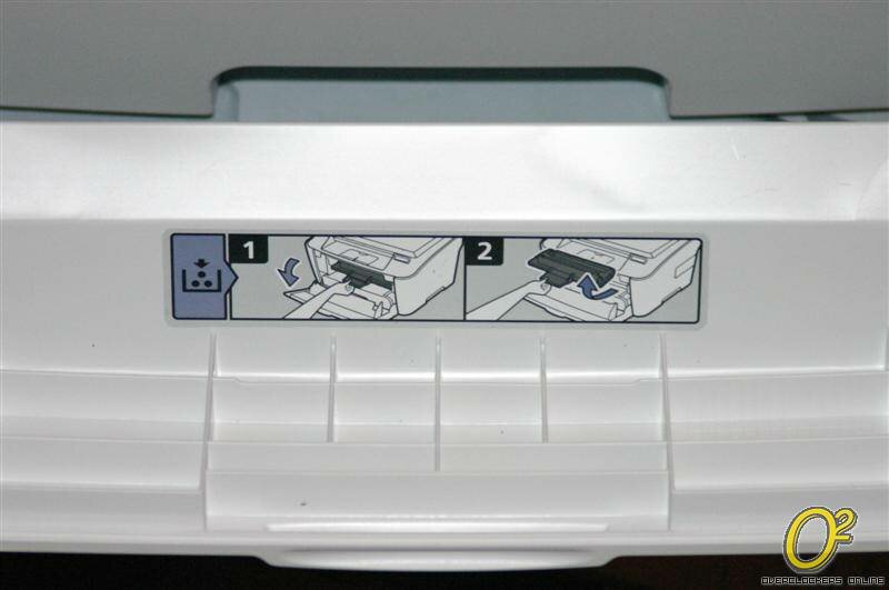 Just above the paper tray is the cover for the toner cartridge. A two step toner installation process is shown on the inside cover. As we'll see later in the review, it really is only a two step job!