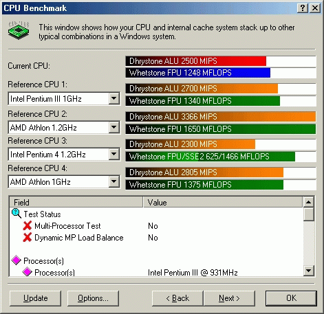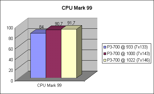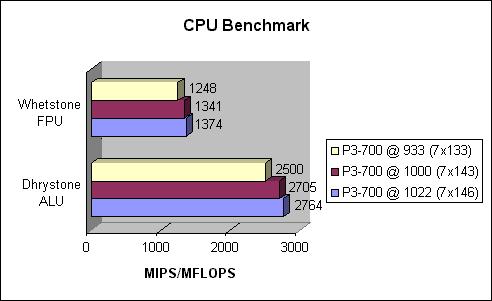 I didn’t bother trying to run the P3-700E @ stock speed. I immediately crancked the FSB speed up to 133MHz and guess what … the system was perfectly stable @ 933MHz (7x133MHz) with a default core voltage (1.65v). As a true overclocker, I definately wanted to reach the 1GHz barrier on this IWill board … no matter what! I figured that this should be no problem because I already pushed it further than 1GHz during my Asus CUSL2 review. 1GHz, here I come!