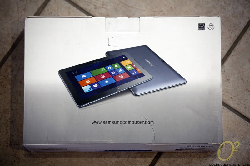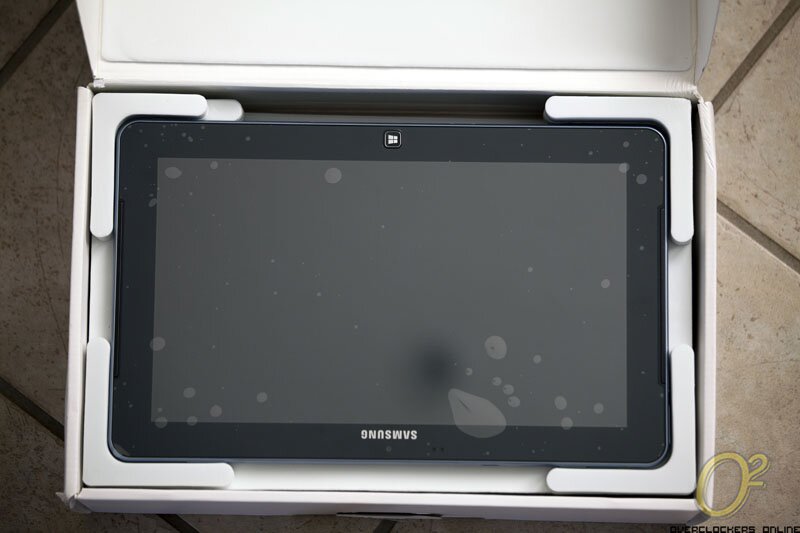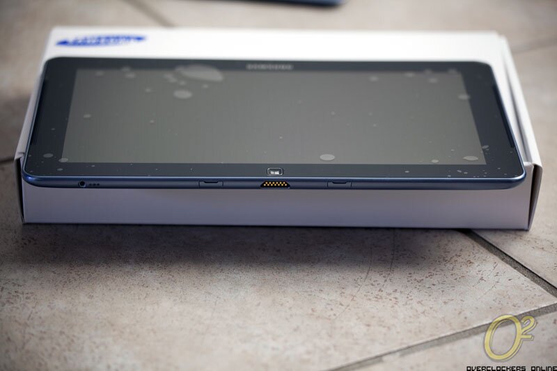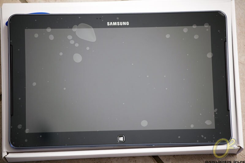 We’ll start our look at the tablet. The screen is protected with a thin plastic film. At the top above the Samsung name is the small 2MP camera. At the very bottom we see a Windows logo, this button will take you back to the homepage from any application you’re running. On the sides are two long thin speakers.