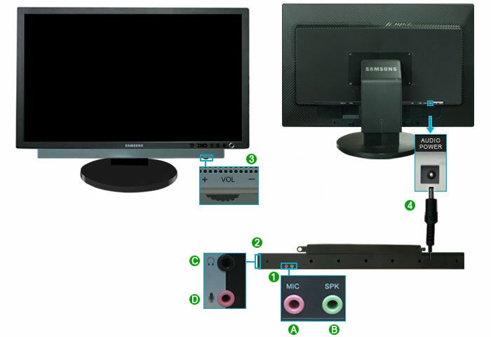 Connect the light green cable of the cables provided when purchasing the speaker to the audio output terminal at the back of the computer.